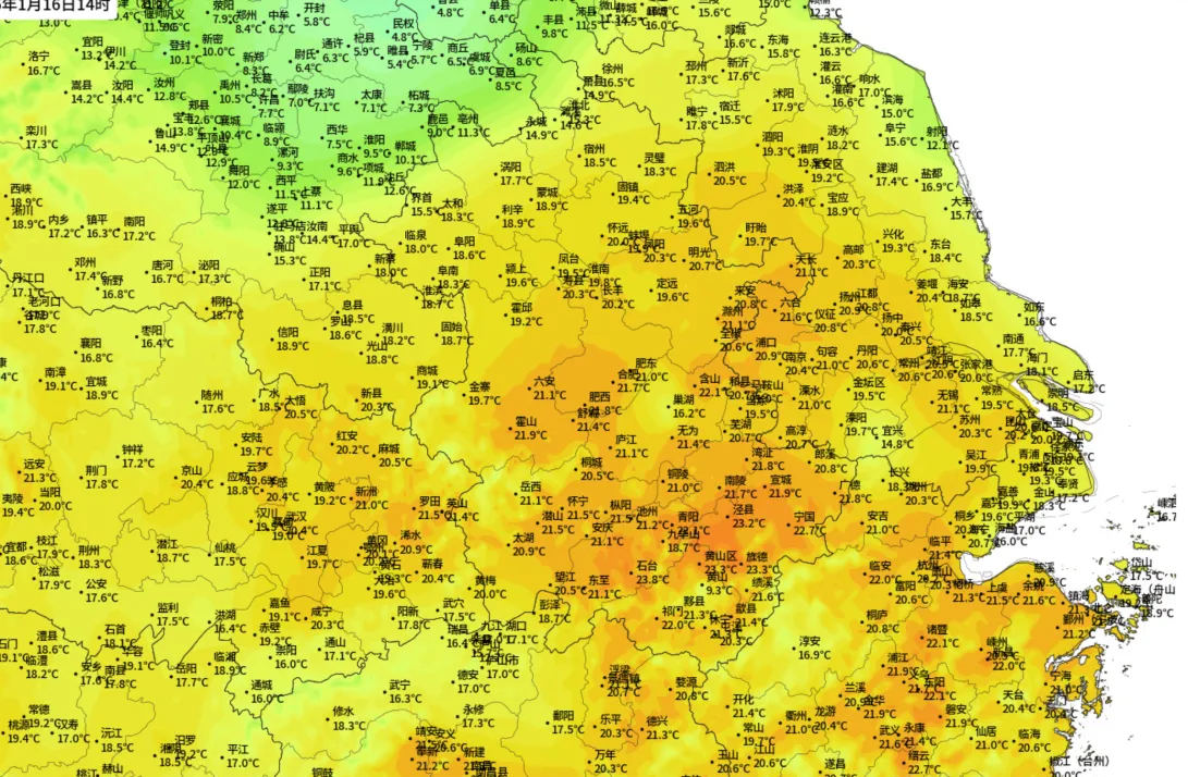 不过与此同时,庞大的1号台风洛鞍已经在菲律宾以东洋面生成,大量水汽从孟加拉湾、南海、东海、黄海涌入我国陆地,1月16日早上南方多地大雾弥漫,上海崇明、江苏沿海局部出现特强浓雾,而下午南方更是极度异常温暖,14点28分前后,南京21.4度,打破了当地有气象记录以来1月最高气温纪录,与此同时,扬州淮安马鞍山等30多个国家站突破1月最暖纪录。而海南广东广西福建江西云南局部更是有了夏日气息,上述各省最高气温都冲上了25度,花草树木、蚊子苍蝇误以为春天到来,或开花或飞舞或咬人。