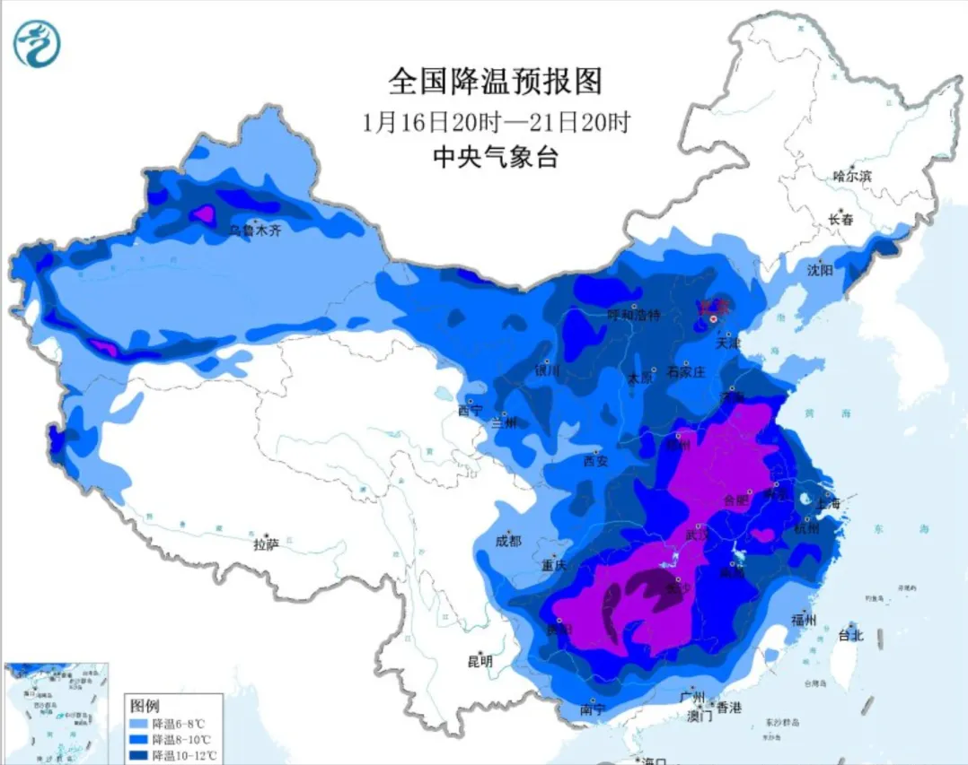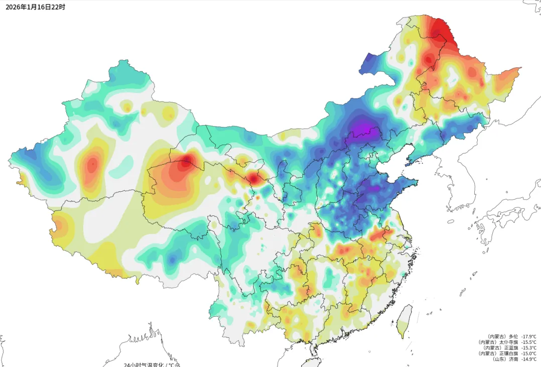 大家都非常关注的大寒潮,已经在阿尔泰山-蒙古高原北部-贝加尔湖-大兴安岭一线集结完毕,冷心所在的中西伯利亚南部已经降到-55度。1月16日晚,寒潮西路主力来到新疆天山边,乌鲁木齐狂风大作,出现风吹雪、白毛风景象;寒潮东路小分队也进入华北西北,内蒙古、陕甘宁、山西、京津冀、河南和山东也刮了点小风,降了十来度。